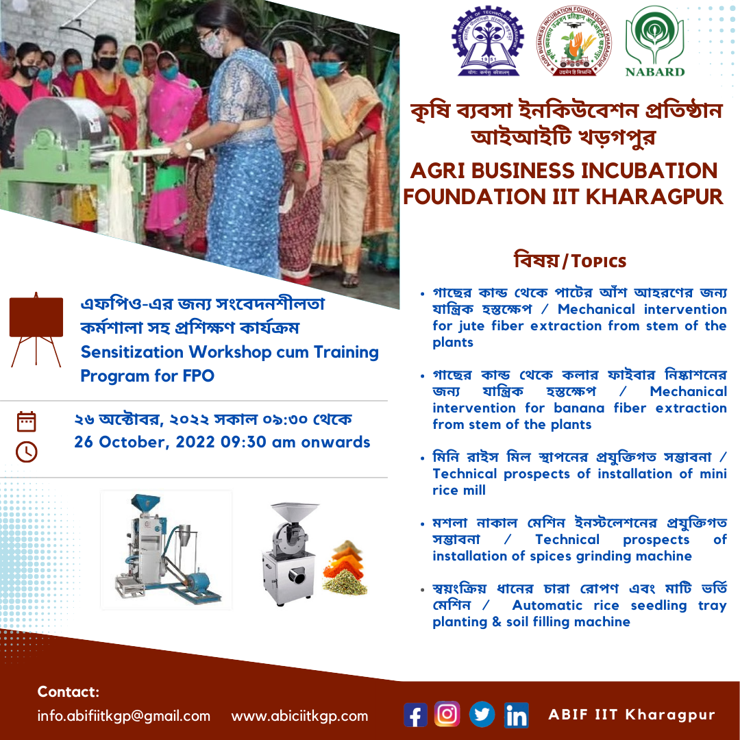 A Sensitization Workshop cum Training Program for FPOs was organized on 26 October 2022 (Wednesday) on following topics to help farmers, FPOs, FPCs etc. for sound understanding of the technical areas and implementation of the same for business enhancement. a. Mechanical intervention for jute fiber extraction from stem of the plants. b. Mechanical intervention for banana fiber extraction from stem of the plants. c. Technical prospects of installation of mini rice mill. d. Technical prospects of installation of spices grinding machine and e. Automatic rice seedling tray planting & soil filling machine. f. The program witnessed 41 participations of the FPO directors and CEOs from the eastern region of the country.