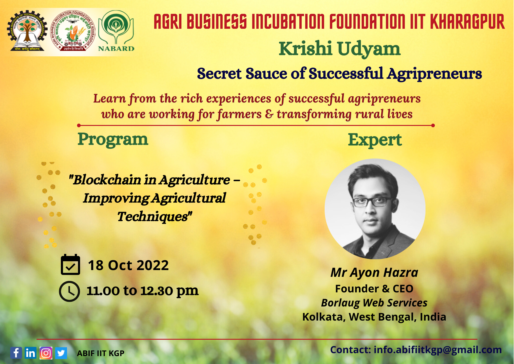 One session in the series of “Krishi Udyam” - Secret Sauce of Successful Agripreneurs, was organized with Shri Ayon Hazra Founder & CEO, Borlaug Web Services on 18 Oct 2022, Kolkata on the topic of “Block chain in Agriculture – Improving Agricultural Techniques”. Mr. Hazra mainly talked about applications of Block chain in Agriculture, its advantages and scope for Agri Business in the domain.
